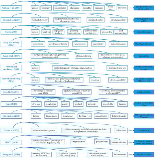 Compared to single-dimensional measurement, multidimensional measures enable a relatively comprehensive capture of the attributes and characteristics of urban sprawl. Subsequently, a number of researchers have attempted to employ multidimensional indicators to measure urban sprawl (Figure 4). Due to the difficulty of data acquisition and calculation, the selection of dimensions and indicators should be based on the core connotation of urban sprawl to ensure the scientific accuracy and representativeness of the indicators. Among the generally used dimensions of measures, density and morphology are the most commonly used ones, whereas land use mix and accessibility may not be included in multi-case studies due to the constraints of data acquisition [40].