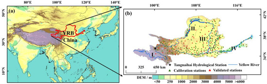 (a) The geographical location of the Yellow River Basin in China; (b) digital elevation model, and distribution of hydrometeorological stations in the Yellow River basin. Region I is the source region of the YRB (SRYR), region II is the upstream of the YRB (UYRB), III is the midstream of the YRB (MYRB), IV is the downstream of YRB (DYRB).