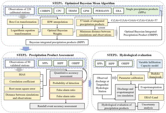 The general flowchart of this research is presented in Figure 3. Firstly, the daily precipitation of 220 calibration stations from 2001 to 2019 was used to estimate the optimal weighted weights for the grid of calibration stations corresponding to six SPPs. BMA relies on all ensemble forecast members, and poor regional simulation of a particular forecast member can affect the overall forecast results. Therefore, Our research selects the OBIPP from 57 Bayesian integrated precipitation products (BIPP) based on the overall characteristics of simulations and observations. Secondly, OBIPP was evaluated for its precipitation simulation performance across the YRB relative to other precipitation products. Finally, a typical SRYR was selected to investigate the reliability and uncertainty of the OBIPP in hydrological simulations.