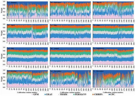 The changes in monthly weights indicated by BMA at different calibration stations were calculated and shown in Figure 4. For the 222 calibration stations, the monthly weights are expected to have significant differences, indicating that it is necessary to consider the impact of monthly changes on the weights when structuring BMA. The weights of the non-rainy season (November to March of the following year) at different calibration stations are revealed to fluctuate significantly (Figure 4a–c,k–l), while the weights are stable during the rainy season (April to October) (Figure 4d–j). In most calibration stations of the rainy season, the weights of ERA and GPM are the largest, indicating that ERA and GPM have the highest score on the simulation ability of daily precipitation in the rainy season.