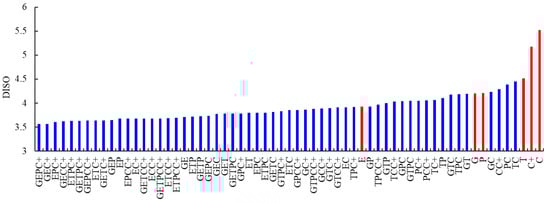 Difference between the observations and simulations of IPPs under the different combinations across the YRB. DISO is the average value of all calibration stations, and GPM, ERA, TRMM, PERSIANN-CDR, CHIRPS, and CPC are abbreviated as G, E, T, P, C, and C+. For example, GEPC+ is the integrated result of GPM, ERA, PERSIANN-CDR, and CPC. Among them, the red column represents the single precipitation products, and the blue column represent the integrated precipitation products.