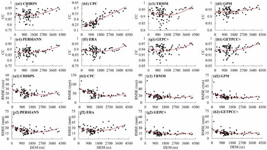 Firstly, we evaluated the dependence of monthly precipitation products on altitude (Figure 7). It can be observed from Figure 7(a1–h1) that the CC values of the CPC show an obvious upward trend with the increase in altitude. In contrast, CC values of the other products offer a slight change trend, indicating that the agreement between simulations and observations of CPC is more dependent on altitude than other products. All eight products with an elevation between 900 and 1800 m have the lowest RMSE. The RMSE values of the TRMM, GPM, GEPC+, and GETPCC+ offer the slightest change, indicating that the error magnitude of these four products is less dependent on elevation (Figure 7(a2–h2)).