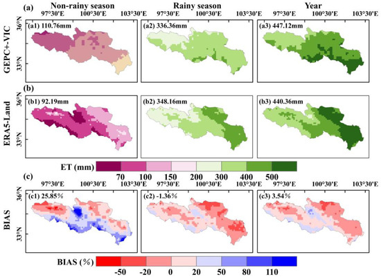 Comparison between GEPC+ simulated evapotranspiration and ERA5 Land evapotranspiration products. This study is divided into three periods: the non-rainy season, the rainy season, and the year. Results of GEPC+-VIC simulation (a) and ERA5 Land (b) and their relative deviation (c).