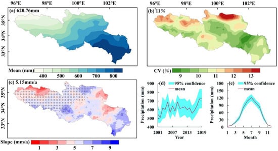 The uncertainty of spatial and temporal distribution of precipitation across the SRYR is crucial for runoff simulation. Figure 11a shows the annual mean precipitation values distribution from OBIPP. Annual mean precipitation shows a spatial pattern increasing from northwest to southeast. In the southeastern region, the mean precipitation is higher than 800 mm, while the mean precipitation in the northwestern region is lower than 400 mm. Figure 11b shows the precipitation uncertainty across the SRYR by the coefficient of variation. The coefficient of variation value is about 11%, and the precipitation variation is mainly concentrated in the northeast, where the coefficient of variation is above 13%. During 2001–2019 (Figure 11c,d), the average precipitation across the SRYR was about 621 mm, with fluctuation intervals (95% confidence intervals) ranging from 341 to 900 mm. It shows an overall trend of significant increase (5.15 mm/a). In addition, the precipitation across the SRYR has noticeable seasonal differences, with most of the precipitation concentrated in summer, and the average precipitation from May to September is higher than 100 mm/month, while the average precipitation from October to April is lower than 18 mm/month (Figure 11e).