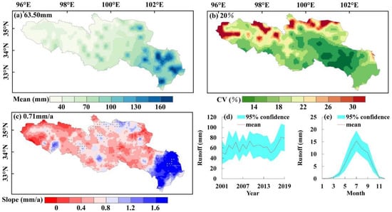 Figure 12a shows the spatial distribution, uncertainty, and change trend of runoff simulated by OBIPP across the SRYR. The annual average runoff depth across the SRYR presents a spatial distribution similar to precipitation, showing an increasing spatial pattern from northwest to southeast, from more than 160 mm to less than 40 mm. The uncertainty of runoff depth is mainly concentrated in the northwest of the SRYR, with a variation coefficient of more than 20% (Figure 12b). During 2001–2019, the average runoff depth across the SRYR was 63.50 mm, with a fluctuation interval (95% confidence interval) of 42–84 mm; The runoff depth generally shows an increasing trend, about 0.71 mm/a, while the runoff depth in the southeast increases with a trend of more than 1.6 mm/a (Figure 12c,d). The runoff depth across the SRYR is similar to the precipitation, with noticeable seasonal differences. The high value of runoff depth is concentrated in summer. The average runoff depth from May to September is higher than 11 mm/month, while the average runoff depth from October to April is lower than 2 mm/month (Figure 12e).