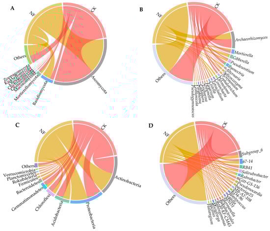 The distribution of abundant taxa with relative abundances > 1% in at least one sample. (A), Soil fungal community at phylum level; (B), Soil fungal community at genus level; (C), soil bacterial community at phylum level; (D), soil bacterial community at the genus level. NF: no-tillage reseeding and fertilization. CK: control check.