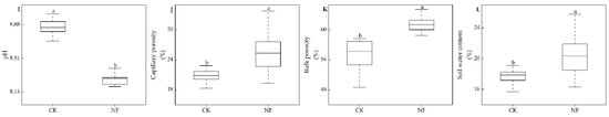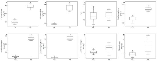 Effects of main land-use types on single ecosystem functions. (A), organic carbon; (B), total nitrogen; (C), C:N; (D), total phosphorus; (E) available nitrogen; (F), available phosphorus; (G), ammonia nitrogen; (H), nitric nitrogen; (I), pH; (J), capillary porosity; (K) bulk porosity; (L), soil water content. a/b: Different lowercase letters represent significant differences between NF and CK (p < 0.05).