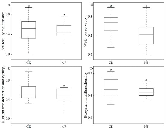 Effects of main land-use types on ecosystem functions. (A), soil fertility maintenance; (B), water conservation; (C), nutrient transformation and cycling; (D), ecosystem multifunctionality. a: Same lowercase letters represent nonsignificant differences between NF and CK (p > 0.05).