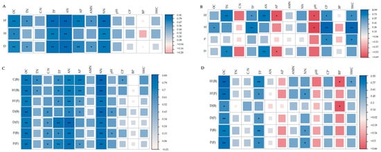 Correlation analysis between species diversity indices and single ecosystem functions in NF and CK. * p < 0.05, ** p < 0.01. (A), correlation analysis between plant diversity indices and single ecosystem functions in CK; (B), correlation analysis between plant diversity indices and single ecosystem functions in NF; (C), correlation analysis between bacterial diversity indices and single ecosystem functions in CK; (D), correlation analysis between bacterial diversity indices and single ecosystem functions in NF. H, H’, D, and P: Margalef index of the plant community, Shannon–Wiener index of the plant community, Simpson index of the plant community, and Pielou index of the plant community. C(F), P(F), H’(F), D(F), C(B), P(B), H’(B), and D(B): the Chao1 index of fungal community, Pielou index of fungal community, Shannon–Wiener index of fungal community, Simpson index of fungal community, Chao1 index of the bacterial community, Pielou index of the bacterial community, Shannon–Wiener index of the bacterial community, Simpson index of the bacterial community. OC, TN, C:N, TP, AN, AP AMN, NN, pH, CP, BP, and SWC: organic carbon, total nitrogen, C:N, total phosphorus, available nitrogen, available phosphorus, ammonia nitrogen, nitric nitrogen, pH, capillary porosity, bulk porosity, and soil water content.