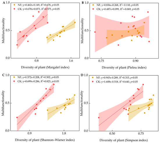 The relationship between plant diversity and ecosystem multifunctionality. Yellow and red colored dots indicate NF and CK, respectively. The translucent areas indicate 95% confidence intervals. (A), Margalef index of plant diversity; (B), Pielou index of plant diversity; (C), Shannon–Wiener index of plant diversity; (D), Simpson index of plant diversity.