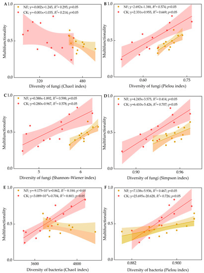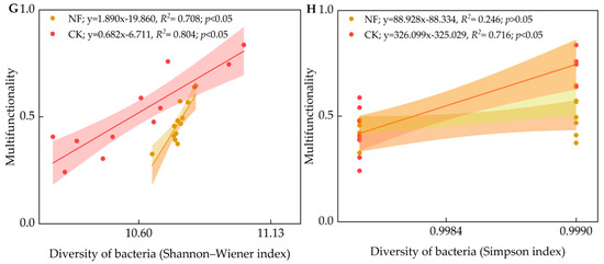 The relationship between microbial diversity and ecosystem multifunctionality. Yellow and red colored dots indicate NF and CK, respectively. The translucent areas indicate 95% confidence intervals. (A), Chao1 index of fungal diversity; (B), Pielou index of fungal diversity; (C), Shannon–Wiener index of fungal diversity; (D), Simpson index of fungal diversity; (E), Chao1 index of bacteria diversity; (F), Pielou index of bacteria diversity; (G), Shannon–Wiener index of bacteria diversity; (H), Simpson index of bacteria diversity.