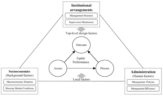 From a regional perspective, this paper adopts the three aspects of equity, namely, access–process–outcome, to establish the conceptual framework for exploring the HPF performance (Figure 1). Access performance refers to the equality of opportunities for individuals to participate in the program. Process performance evaluates the operation of the HPF from two aspects: deposit and use of funds. Outcome performance measures the loan benefit level of participants. We first explore the three types of performance from a spatial view. Thereafter, we discuss how the access and process performance exerts an influence on the outcome performance by controlling the relevant variables of local socioeconomic development and HPF administration.