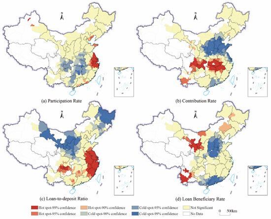The mean contribution rate showed a downward trend (Table 2), changing from 10.24% in 2015 to 9.79% in 2020. Table 3 shows that compared with eastern cities, central and western cities had a higher contribution rate. Then, middle-sized and small cities exhibited a higher contribution rate than larger-scale cities. Figure 2 reveals that provinces including Sichuan, Chongqing, Hubei, Hunan and Jiangxi were the hub of the hotspots. Then, the loan-to-deposit ratio showed a fluctuating increase from 74.38% in 2015 to 82.98% in 2020, indicating that utilization level of HPF loans in general has been improved. Eastern cities show better use of HPF loans, and the performance of small cities is far behind other cities. Figure 2 also shows that the hotspots were mainly distributed in eastern coastal and southern provinces. Note that the improvement in the loan-to-deposit ratio during the past five years is more pronounced for central and western cities, as well as mid-sized and small cities.