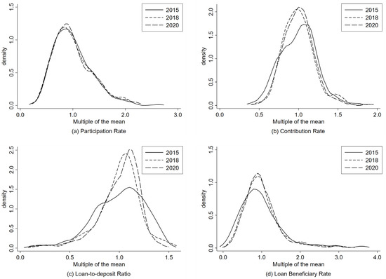 In terms of outcome performance (Table 4), the continuous decline of the variation coefficient and Gini index revealed that the intercity difference of loan beneficiary rate is narrowing. Compared with 2015, the horizontal distribution range of the loan benefit ratio curve in 2018 and 2020 was significantly narrowed, and the peak was significantly increased and moved to the right (Figure 3). The findings indicate that the loan beneficiary rate of cities has been generally improved, and the spatial disparity has been alleviated. In addition, the long tail on the right side of the curve implies that the loan beneficiary rate of a few cities is far ahead of the rest.