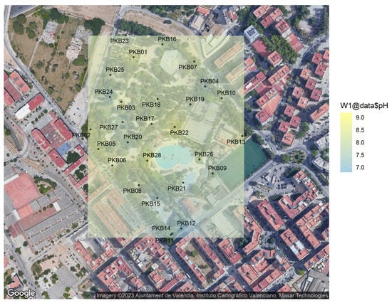 Kriging distribution of pH measurements (black dots) at Benicalap park.