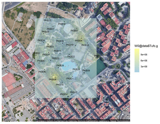 In this study, we investigated the microbial communities existing in one of the most emblematic urban parks in the city of València. The park is a green space and serves as a recreational area, so microbial exchanges must be frequent. As it is surrounded by busy streets in a completely urban environment, the park’s ecological function could be under threat due to continuous use for many generations. To this end, we determined the microbial concentration, particularly bacterial, at various points in the park by conducting a globalized study using the Kriging strategy.