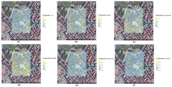 Kriging mapping of inhibition against different pathogens: (a) E. coli, (b) S.aureus, (c) K. pneumoniae, (d) Salmonella sp., (e) P. fluorescens, and (f) Ent. cloacae.