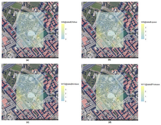 However, urban parks are home to a large number of microorganisms that can be sources of enzymes with industrial applications. A set of four biochemical tests was performed to detect possible enzyme producers of interest with DNase, lipase, amylase, and protease activities among all isolated bacteria (Table 3). Between 10 and 24 isolates tested positive. For the distribution of the results (Kriging representation), see Figure 5.