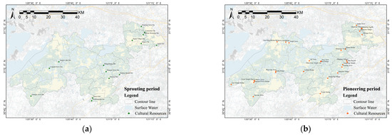 Temporal and spatial distributions of cultural resources in the demonstration area. (a) Sprouting period; (b) pioneering period; (c) boom period; (d) transition period.