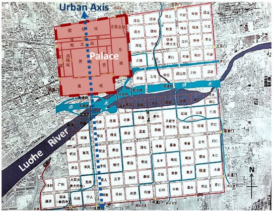 The spatial structure of ancient Chinese cities is a figurative expression of traditional planning thought processes, as they contain the planners’ treatments of natural landscape patterns and the rulers’ will to power [33]. Although the ancient capital of Luoyang has been relocated several times over the ages, the emperor’s palace city and the city’s axis arising from it dominated the layout of the entire city, which highlighted the emperor’s authority and constituted the soul of the city, whether in the Han and Wei dynasties or the Sui and Tang dynasties. For instance, the restoration map of Luoyang City during the Sui and Tang dynasties revealed that the flowing Luo River split the city into two sections, the north, and south, with the palace city positioned in the north-west rather than in the city’s center (Figure 2). Since the city’s central axis is to the west, and it is not a centrally symmetrical city, Luoyang’s layout under the Sui and Tang dynasties differed from that of most ancient Chinese cities. According to the archives, a unique landscape city axis pattern was created when Yu Wen Kai settled the palace opposite Longmen Ique and extended it south to Shangqing Palace, on Mount Mang [34].