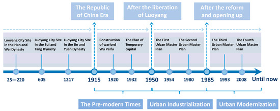 With the gradual excavation of ancient ruins—including those from the Eastern Zhou Dynasty’s royal city and Luoyang City during the Sui and Tang dynasties—Luoyang is gradually regaining its urban memory and enhancing the landscape features of its historical city, which are part of its magnificent, historical royal capital. The heritage venue, which serves as the historical landscape’s anchor point, generates material and immaterial radiation to the historical landscape’s layered space. It also influences the macroscopic urban spatial structure and the microscopic neighborhood style. This power is the primary force behind the historical urban landscape’s overall spatial formation [35]. It was posited that Luoyang’s urban space has undergone a unique process of historical landscape formation, which has included continuous reverse layering. In the paper, the historical landscape layering research should be separated into three periods, namely: the pre-modern period (1915–1950); the period of urban industrialization (1950–1985); and the period of rapid urbanization (1985–2020) (Figure 3).