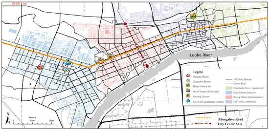 Luoyang, a well-known ancient Chinese capital, has repeatedly been destroyed and rebuilt throughout history. As a result, despite the continuity of some regional traits, which have been maintained during its urban growth, the historical environment and the places of the city have not been continually and entirely inherited [29]. In contrast to the traditional Chinese central axis and the symmetrical urban spatial structure of other significant Chinese capitals, such as Beijing and Xi’an, Luoyang’s current urban spatial structure exhibits a belt pattern, which runs along the river. Its urban axes also comprise the current multi-axis, composite urban spatial pattern, which has undergone continuous historical accumulation [30]. Therefore, establishing how to identify Luoyang’s urban historical axes was a key issue in this study, because of the superposition of urban axes from different historical periods. Another key issue was how to establish a system for Luoyang’s historical urban axes to integrate the fragmented historical urban landscape.