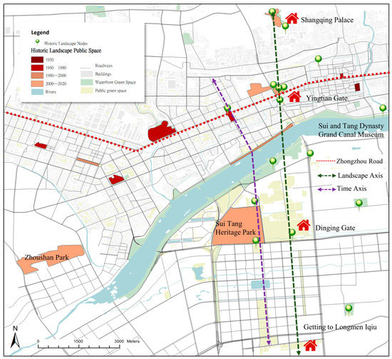 This study has used the method of historical map translation to examine the construction and evolutionary process of Luoyang’s historical urban landscapes and its internal urban structure. The dynamic identity and changing character of cities can be represented through the identification of the structures, places, and other traditional cultural elements of historic urban landscapes and through the analysis of their historical contexts and evolution. This allows us to identify a city’s historical axis based on the spatial structure’s evolution over time. This can be one of the reference frames that guide today’s urban renewal. The future is a continuum of the past and present, and urban renewal is a technical method of the material form and a means of preserving the continuity and integrity of a city’s historical landscape [57]. The construction of an urban historical axis system can efficiently integrate all components of the urban spatial system, establish urban historical resource lines, and create a distinctive urban cultural belt.