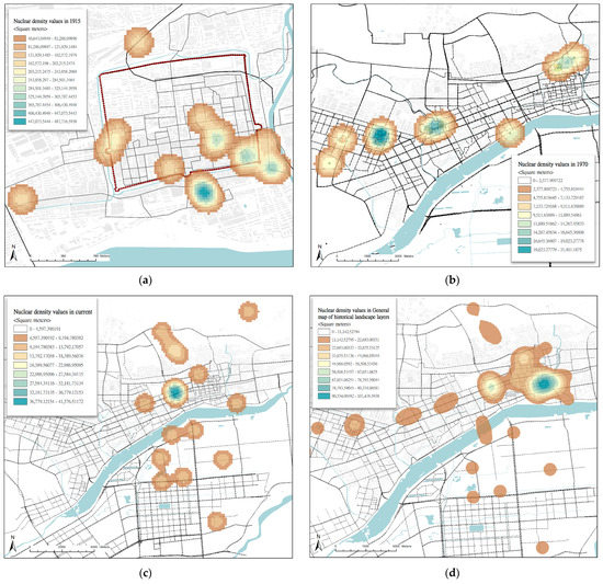 Hierarchical historical landscape analysis is an ephemeral analysis of historical landscapes’ heritage elements, which describes an urban spatial transformation through the superposition of overall or local historical heritage elements in each period [36]. This paper extracted historical urban landscape spatial carriers, such as linear structural elements (roads and alleys), landmark buildings, and landscaped public spaces. The different historical landscape carriers were superimposed vertically, with time attributes as vertical clues. The translated historical landscapes of different periods were analyzed through superimposed maps, using ArcGIS software and its spatial analysis method. Additionally, we extracted the raster data to investigate the spatial agglomeration relationships (Figure 4).