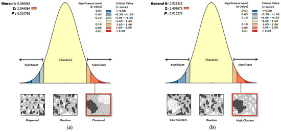 (a) Space autocorrelation statement; (b) High/low clustering analysis (images provided by ArcGIS Screenshot).