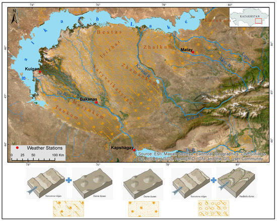 The Southern Balkash depressions were located in the deserts that took shape in the Neogene. Paleogene deposits are found mainly on the periphery. Paleogene and Neogene formations lie like a mantle on the leveled surface of the Paleozoic. In the Quaternary period, the active formation of the relief was accompanied by the accumulation and redistribution of deposits. This process developed against intense tectonic movements and climate fluctuations, which caused great diversity in the genesis of Quaternary deposits and significant differences in their thicknesses [53]. Modern aeolian deposits are widespread in the Southern Balkash depression. Their composition is feldspar-quartz. Granites, amphiboles, mica, chlorite, and epidote are found in trace levels in the sands; apatite, hematite, pyroxene, and sphene are less prevalent [54]. According to the geomorphology of the sands, the transverse parabolic sands (48%) are dominant in the region, and they cover Saryesikatyrau, Bestas, Zhamankum, and Irizhar sands. Dome dunes (24%) cover the eastern sands, including the Karakum and the southern part of the Saryesikatyrau. Transverse-dome dunes cover the Taukum and Moiynkum deserts with an area of 23% to form the territory of the Southern Balkash deserts (Figure 1).