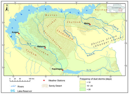 The Southern Balkash deserts in Kazakhstan are regions with the most frequent storms. (Figure 2). Dust storms, occurring at a frequency of more than 20 days, are common in the coastal areas of the Balkash Lake and Ile River basin, primarily in Moiynkum, Bestas, and western Saryesi-katyrau sands. In addition, the Taukum, Zhalkum, Irizhar, and Saryesikatyrau deserts are subject to dust storms at a frequency of 10–20 days per year. Mountainous areas were comparatively less prone to dust storms. The frequency of their occurrence was <10 days/year (Figure 2). The annual amount of days with deflationary processes in the form of storms reached 30–90 days in the Moiynkum and Taukum deserts, decreasing to 10–20 days in the foothills of the Zhetysu (Zhungar) Alatau [36].