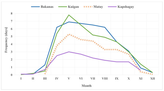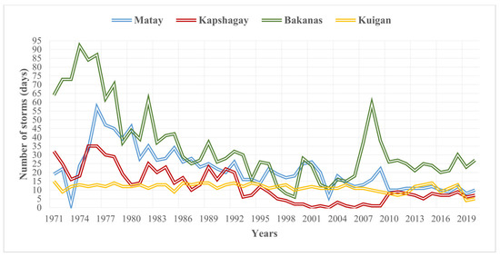 Because of the sharp rise in temperature and high wind speed in the spring [59], the surface of southern deserts deteriorates in theintensive evaporation of humidity, which, together with strong winds, contributes to the development of dust and sand storm phenomena. As a result, the southern deserts of the Balkash (meteorological stations: Bakanas, Kuigan, and Matay) are one of the main areas of Kazakhstan where regular storms occur, especially in the period from April to August and April–September (Figure 4). The average annual duration of storms for the period 1966–2003 was 43 days at the Bakanas meteorological station, 40 days at the Kuigan station, and 28 and 17 days per year at the Matay and Kapshagay stations, respectively.