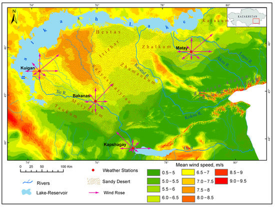 In Kazakhstan, the wind regime mostly has a continental character. It is conditioned mainly by local barik-circulation conditions, depending on orographic features, sun exposure, and topography [60]. The wind speed is variable within Kazakhstan, and it is high mainly in the desert zone. Almost 50% of the territory of Kazakhstan has an annual wind speed of an average of 4–5 m/s. It can reach a speed of ≥6 m/s in the Caspian Sea’s coastal areas, mountain passes, and corridors in the south and southeast of Kazakhstan. In the Southern Balkash deserts, wind speed ranges from 0.5 m/s in the mountainous areas to 8 m/s toward the deserts (Figure 5). The maximum wind speeds occur in the spring—summer period, meaning that deflation processes are intense at this time [61,62].