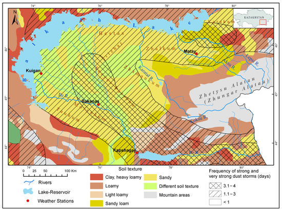 Numerous archive cartographic materials with information on soil texture [50] and plant communities [51] were selected to investigate the sources of aeolian processes and dust storms in the Southern Balkash deserts in Kazakhstan.