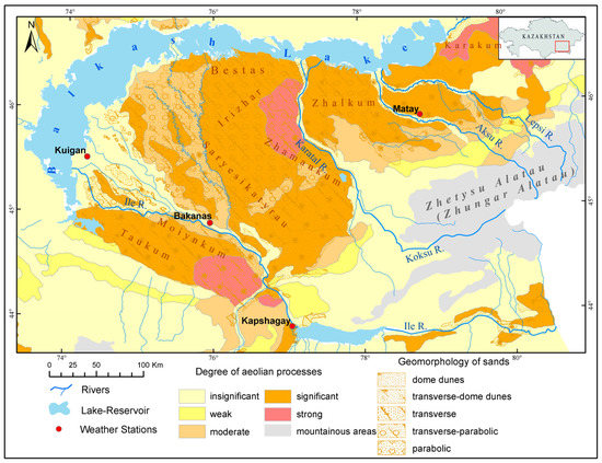 Aeolian processes are actively manifested in the sandy and sandy loam deposits of the Southern Balkash deserts, which are locally weakly fixed by vegetation. Silty sands and light sandy loams are intensively blown and contribute to the formation of large massifs of scattered sands in the Southern Balkash deserts. The sandy massifs of the Southern Balkash deserts, such as the Taukum, Saryesikatyrau, and Moiynkum deserts, have an elongated direction due to the northwestern and northeastern winds and aeolian processes that partly took part in their formation. According to the composed map, the degree of the occurrence of the aeolian process is significant and strong in most of the Southern Balkash deserts (Figure 7). In the Taukum sandy massifs, aeolian processes are most active in spring [56], and its eastern part is prone to them to a strong degree (Figure 7). As well as the northern part of the Zhamankum sands (the left bank of the Karatal river) and Karakum sands (eastern coast of the Balkash Lake) are subject to the aeolian process to a strong degree (Figure 7).