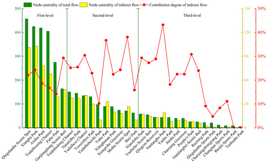 The total centrality of nodes in the indirect flow was 810, accounting for 22.2% of the total centrality of nodes in the total flow. The indirect flow had a certain complementary effect on the total flow. In terms of growth, there was a positive correlation between the centrality of nodes in the indirect and total flow. In general, the higher the centrality of a node in the indirect flow, the higher the centrality of the node in the total flow (Figure 3). The indirect flow showed whether long-distance nodes were attractive to exercisers. The centrality of first-level nodes in the indirect flow was higher, which means that they were more attractive than long-distance ones, so more people entered them through other nodes. In contrast, the centrality of third-level nodes in the indirect flow was generally low as they were the least attractive. The contribution of the indirect flow represents the ratio of centrality between each node in the indirect to that in the total flow. Based on the contribution, the indirect flow had a greater effect on some second-level nodes. The contribution of the indirect flow of Nantanghu Park, Meihu Scenic Spot, and Yuhu Park was more than 35%, indicating that these spaces were very attractive and play an important role in the flow network.