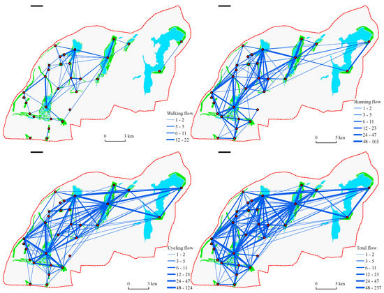 Moreover, this study calculated the proportion of the flow of the different types of exercise under the given distances. It was found that people performed different types of exercise at different distances. With the increase in distance, the proportion of the walking and running flow decreased, while that of the cycling flow gradually increased. The running flow accounted for the largest proportion at 0–2 km (61.39%), but when the distance increased to 2–4 km, the cycling flow accounted for more than half of the total flow. When the distance was greater than 6 km, the cycling flow dominated.