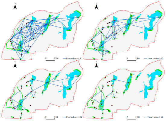 The flow volume between nodes was different, so the characteristics of the network under different flow volumes were different, too. According to the difference in flow volume between nodes, the total flow was divided into four levels: Gij ≥ 3, Gij ≥ 12, Gij ≥ 24, and Gij ≥ 48 (Table 3 and Figure 5). With the increase in the flow volume, the number of nodes, the number of paths, and the proportion of the flow decreased. The flow between two nodes increased with the increase in the flow volume. With the increase in Gij, network density first decreased and then increased. However, there was no obvious relationship between network centrality and the change in the flow volume. When Gij ≥ 3, the proportion of the total flow reached 97.09%, dominating the flow network and constituting the basic structure of the flow network in the green space. As can be seen from Figure 5, with the increase in flow volume, primary nodes and main flow paths appeared. When Gij ≥ 48, there was still a large flow between adjacent first-level nodes, such as Qingshanhu Sports Park and Aisihu Park, while the flow between adjacent third-level nodes, such as Bayi Park and Ruzi Pavilion, stopped. This shows that large green spaces with larger distances between them have higher interconnection than small green spaces close to each other.