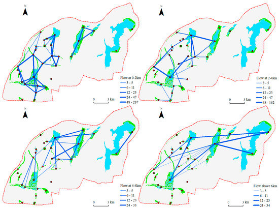 With the increase in distance, the number of nodes, the number of paths, and the flow between nodes gradually decreased. In this case, other indicators had no obvious relationship with the change in distance (Table 4). Generally speaking, distance had an important influence on the flow of green exercise and the law of distance attenuation was obvious. The larger the distance between nodes, the smaller the flow between them. When the distance was 0–2 km, the average flow of a path was 22.87, indicating that short-distance flow dominated the flow of green exercise. However, there was a great difference between nodes at the same distance in the flow. For example, the flow between Qingshanhu Scenic Spot and Yudaihezong Channel was much larger than that between Yudaihebeizhi Park and Xianshihu Park, indicating that the intensity of the spatial connection between larger green spaces was greater than that between small ones. As can be seen from Figure 6, when the distance was 0–4 km, the flow volume of some paths was very large (more than 48). When the distance was greater than 6 km, there were still some paths with a large flow volume (greater than 24), indicating that distance is not the only factor that influences the flow in the urban green space network.