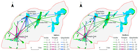 Secondly, weighted distance showed how dominant first-level patches were in the flow network. It was proven that the greater the weighted distance, the greater the influence of the node on the regional flow of green exercise. Because it is located in the city center, the Qingshanhu Scenic Spot had the highest weighted average distance based on the outflow (3.77 km), making it the largest scattered center for green exercise. Next, the weighted average distance of the inflow and outflow of Aisihu Park was greater than 2.5 km. This means that it is far from the city center and first-level patches and corridors, so a person needs to go a long way to reach Aisihu Park through first-level nodes. The weighted average distance between the inflow and outflow of Xianghu Park was relatively low (both less than 1.9 km). This result is related to the park’s adjacent patches and corridors, meaning that the flow of green exercise mainly occurs between adjacent nodes.