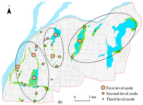 When Iij ≥ 12, it was found that three agglomeration maps formed in the study area. Furthermore, this study considered Iij ≥ 24 as the main and 12 ≤ Iij < 24 as the secondary flow. Combined with node hierarchy and flow characteristics, the whole flow network was divided into three subnetworks: Qingshanhu, Xianghu, and Aisihu, with first-level patches at their centers (Figure 8a). In the actual flow, subnetworks were relatively independent. However, the relationship between subnetworks was still maintained through the main flow path. Within a subnetwork, there was a close relationship between nodes. Particularly, the first-level and the second-level nodes were mainly connected through the main flow, while the third-level nodes were connected to other nodes through the secondary flow. Based on these findings, this study drew a spatial diagram of the flow between nodes in the subnetworks (Figure 8b).