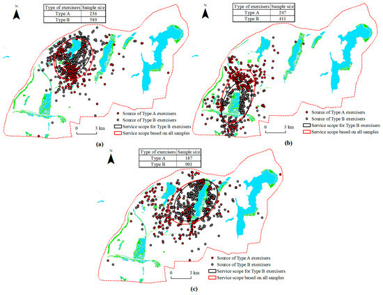 Source and distribution of different types of exercisers in the first-level patches: (a) Qingshan Scenic Spot; (b) Xianghu Park; and (c) Aisihu Park.