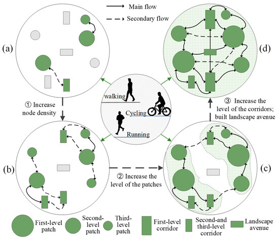 Secondly, patch level should be improved. The flow between the green spaces is related to the level of its patches. A first-level patch is an important driver of the regional flow. Therefore, when considering the construction of an urban green space network, the construction of central nodes should be encouraged (Figure 10c). Possible measures include expanding the area of an existing green space or improving its quality (increasing the length of the exercise routes) to have more attractive spaces. Because the suburbs have more unoccupied land, new and large patches can be built there to promote the flow of green exercise.