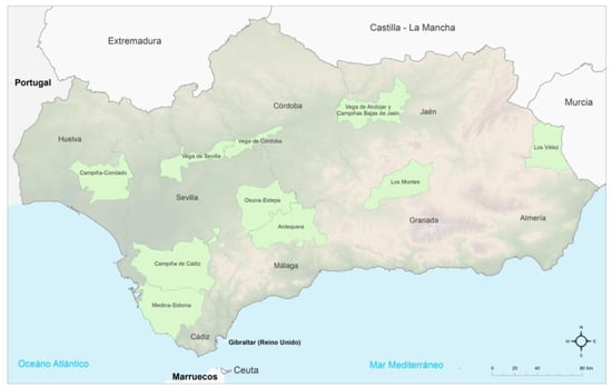- Cano, G. Comarcalización y reforma agrarian en Andalucía. Rev. De Estud. Andal. 1984, 3, 101–124. [Google Scholar]