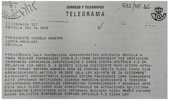 Telegram from the Contentious-Administrative Court of the Regional Appeal Court in Seville to the Governing Council of the Andalusian Regional Government notifying: (1) the application for an interim injunction suspending the decree on the proceedings in the CRA Vega de Córdoba (by the agricultural association Asociación Cordobesa de Empresarios Agropecuarios—ACEA), (2) the request of the administrative file of the decree and (3) the possibility of the Andalusian Regional Government of appearing in court, 1988. Source: [].