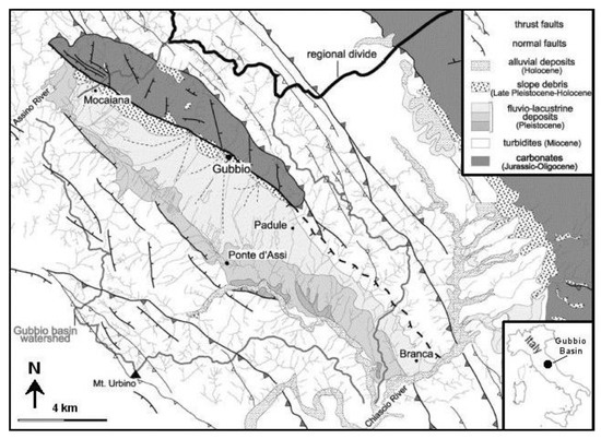 This is a fold mountain belt, verging towards the Adriatic Sea, which was formed due to compressive tectonic induced by the counterclockwise rotation of the Italian peninsula. The compressive tectonic phase, still underway on the eastern (Adriatic) side of the chain, was superimposed in a spatial-temporal sense by an extensional phase of crustal thinning which produced the formation of tectonic trenches, i.e., graben and semi-graben [27,28,29,30]. The Apennine intermontane basins—of which that of Gubbio is the most recent and easternmost, together with Gualdo Tadino—represent the geomorphological expression of this extensional tectonic phase which begun in the Pliocene and still affects the western slope of the Apennine Chain. It is thus responsible for the seismicity present in this area [31,32,33].