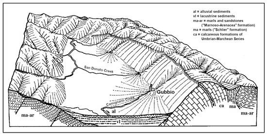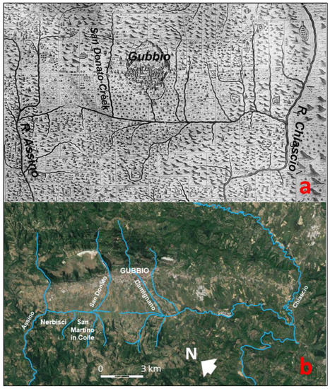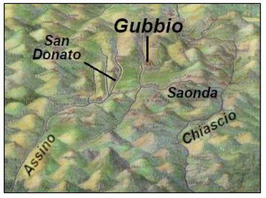 The “river known as Camignano” is the one that crosses the city of Gubbio (Figure 3), parallel to, and a short distance from the San Donato Creek which, evidently, suffered the same effects.