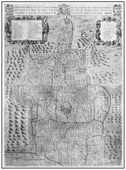In 1567, the bishop of Gubbio (mons. Mariano Savelli) ordered all parish priests of the Diocese to indicate the number of families belonging to their own parish and the distances that separated them from their respective churches. In 1570, the bishop commissioned the cleric don Ubaldo Georgi, who was considered to be an excellent geographer [44], to graphically transpose all the information received. From the data found by Allegrucci [25], it can be deduced that in 1571 Georgi went to Venice with the design of the map and stayed there for a year to have the map engraved; the “coppers” were then brought to Gubbio.