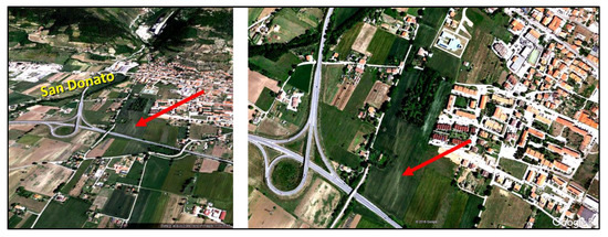On the other hand, the analysis of aerial photos proved to be more important and useful, from which it is possible to identify, through a wider aerial view, any indications of a paleo-riverbed. In fact, the identification of ancient river tracks, especially in lowland areas, is facilitated by the fact that the sub-surface channel deposits are clearly evident, above all following precipitation events, for the different colors they assume due to their degree of humidity and their permeability, different from the neighboring areas. Therefore, the search for aerial photos via Google Earth was very useful, exploiting its potential and above all the fact that the photos present refer to different periods (which can be inspected via the menu item “show historical images”). Among the photos available in this area, there is one in particular whose acquisition date is 29 May 2017. It shows with extraordinary evidence the indications of a drainage line placed along the San Donato Creek at its outlet in the plain of Gubbio, which most likely follows the ancient fluvial track of this stream, as reported in Georgi’s Map (Figure 6), i.e., directed towards the Saonda River.