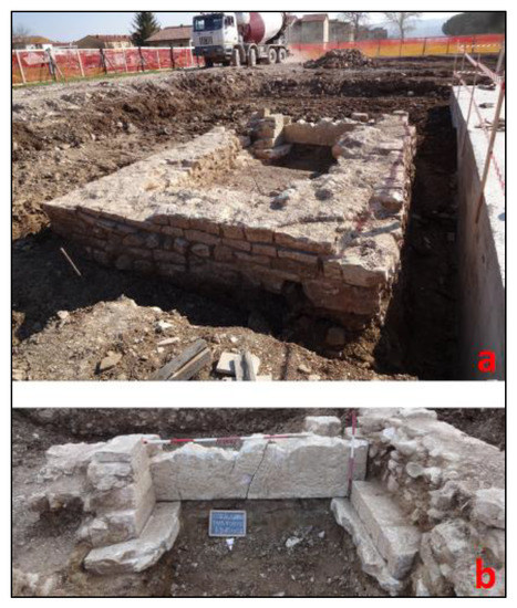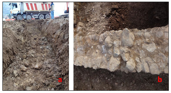 In particular, the excavations of 2014 highlighted the presence of a sedimentary body, which transversely cut the entire construction site at a depth of 0.5–1 m from ground level. This lithosome was clearly distinguishable from the neighboring alluvial sediments and consisted of well-processed pebbles with a good degree of rounding, with an average size of 6–8 cm (also used for the construction of the perimeter walls of the aedicule) in an abundant silty-sandy matrix (Figure 8).